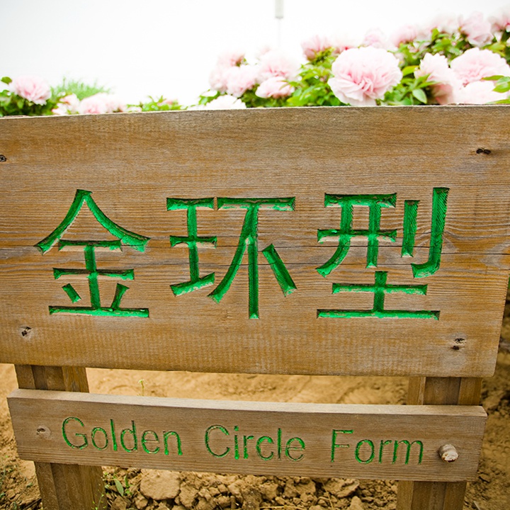 金环型牡丹花中间花瓣和外围花瓣中间有一圈正常雄蕊呈现金环状。它的花蕾圆尖有型,多轮花瓣显得娇俏可爱,花朵层次密疏有度。金环型牡丹花朵排列紧密,属于一种中花品种。