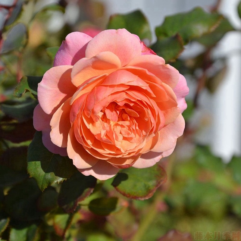 花径8cm多头开放,强烈的柑橘加没药香气。古典四分花型,直立生长,株高80cm。色泽清新甜美,外瓣浅粉红到白色,内瓣橙红到橙黄色。