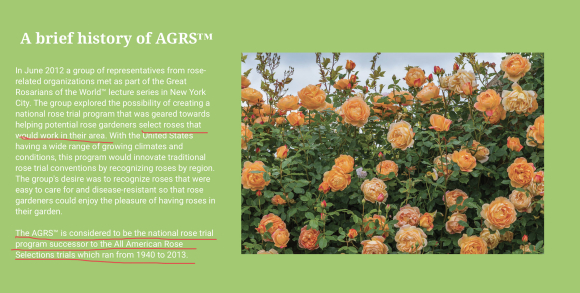 简单来说,这个奖取代了之前久负盛名但逐渐暴露出一些缺陷的全美月季优选大奖AARS(1940-2013),是目前美国的月季业界最高奖,旨在公平公正且更有针对性地提供给月季爱好者们在其所在地区的气候环境条件下表现出色、管理简单的庭院月季品种。它的创新之处就是不再像之前的AARS那样根据全国各地的测试结果汇总打分,而是由美国六个大区(西北、西南、中北、中南、东北、东南)独立测试选出适合当地大部分地区环境的品种并授予AGRS奖项。