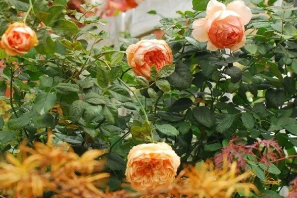 花:春花杏粉色,夏花柠檬粉色;花径8~10cm;完全重瓣(花瓣100~150枚),杯状、四联、古典花型;小簇成群开放;完全四季开花。