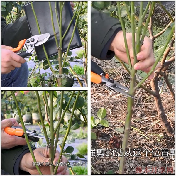 修剪时从下往上,需要看同一高度上,哪些枝条较为细弱,哪些枝条干枯,直接剪掉。