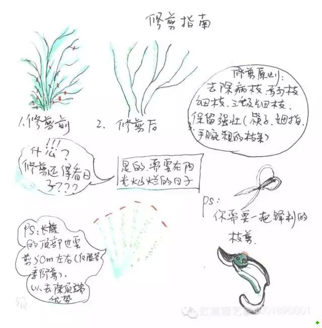 修剪原则:去除病枝、弱枝、细枝、三级细枝,保留强壮的枝条