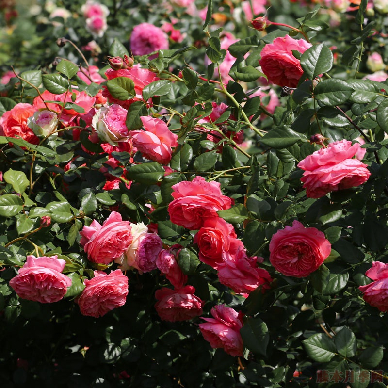 夏日花火它是一款大型灌木月季品种,高度在1.5-2米左右,它的新枝条和新叶片是红色的,叶片长成后油绿有光泽,抗病性非常好,而且分枝多,花量大。
