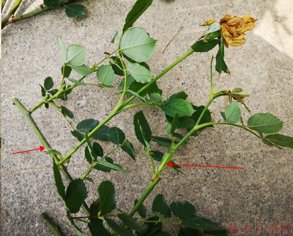 处于老枝中端的强壮枝,这样的枝条留下,冬季牵引后春天会开花,而且可以增加藤本月季的高度。很多花友问藤本月季能长多高,高度其实是可以通过这样的修剪来控制的。