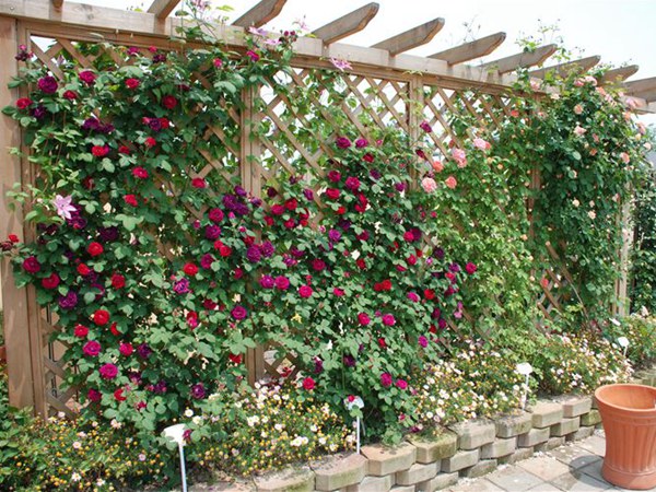 有一面向阳的墙壁,在墙上订一张隔篱网,用来固定藤本月季的枝条,二年就能种出一面藤本月季花墙。