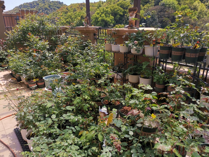一百多平的花园及露台里全部都是月季,这六百多种月季光是浇水也得花上一番功夫。