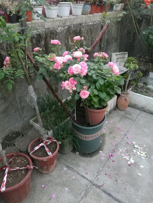 继续改善计划:等待低位冒出砧木侧分支,在低位侧分支上嫁接少量芽点,补充少量开花高度到1.3-1.5M(满足个矮的老婆需求)。