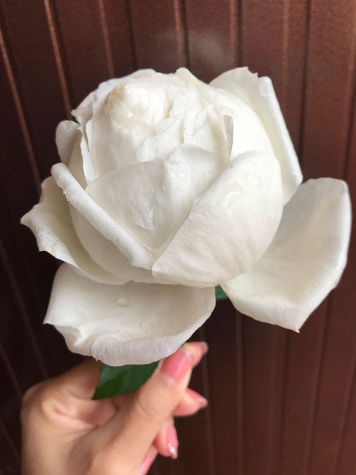 纯洁月季的花朵呈现奶油色或近乎白色的,略带杏色和桃色,花瓣数量丰富,大约在40-50片,包子状逐渐展开为完全开放的玫瑰杯状的花型,花径约8-10厘米,天热花朵会较小在6厘米左右,花型饱满,颜色纯净。