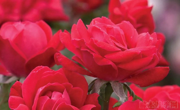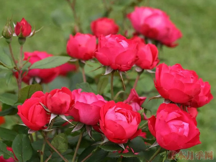 灌木/明亮的樱桃红/温和茶香/花瓣5~13/平均花径9cm//株高60~120cm,冠幅90~120cm。