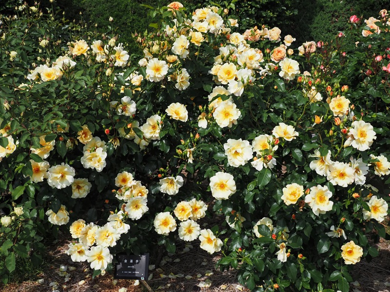 日本京成月季园作出,花名意为“美人的步伐”,玫昂国际代理日本外地区发行;强健抗病的大型灌木,半重瓣乳黄色花朵5-30朵成簇开放,展开后露出朱红色花蕊,在墨绿色叶片映衬下十分美丽;植株耐热性好,适合群植造景、混合花境、炎热地区。