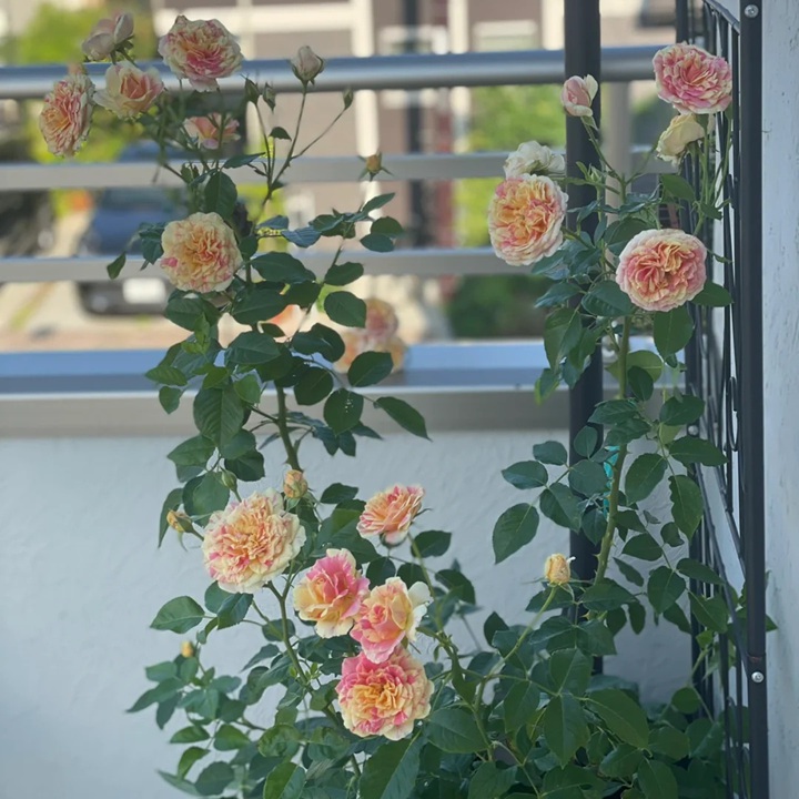 四季之香月季的植株高度在130-150厘米,抗病性比较强,植株的直立性很好,长势快,多头开花,但是刺也是非常多的。