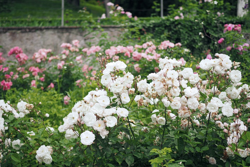 玛丽·帕维叶的花朵玲珑可爱,枝叶清秀,植株气质古典优雅,用在自然式混合花境中效果十分协调,成熟植株开花性非常好,几乎连续不断开花,花朵持久(5-7天),而且植株几乎无刺。