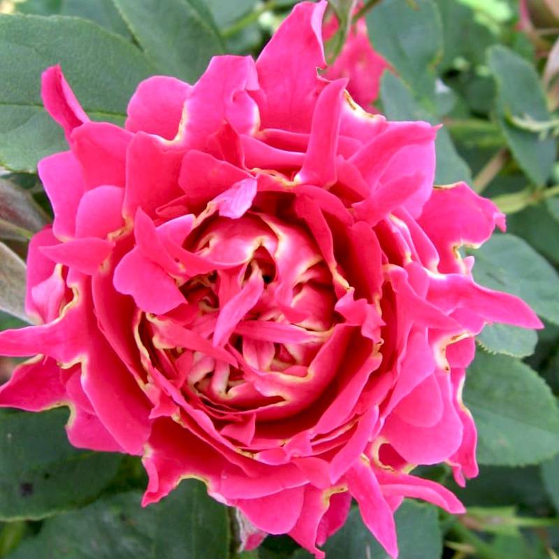 快乐波浪深粉色花朵,直径在6-8厘米之间,花瓣边缘装饰有随机的白色条纹或斑点,花瓣呈现出迷人的波浪形状,基本无香味,具有中等程度的抗黑斑病和白粉病能力,植株高度约为50厘米,接近微型月季的范畴,非常适合小型花园、容器栽培或作为边界植物。