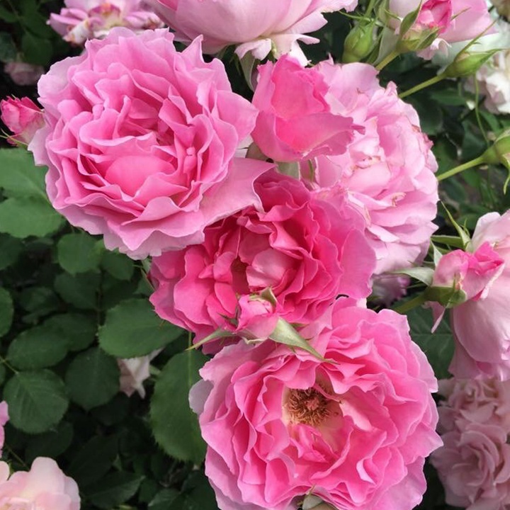 公主粉/粉姬Pink of Princess它的花朵很大,直径在10-12厘米,花瓣50-55枚左右,多头成簇开花,花朵有点类似粉色牡丹,植株高度120厘米。不过香味比较淡,抗病性也比较一般。