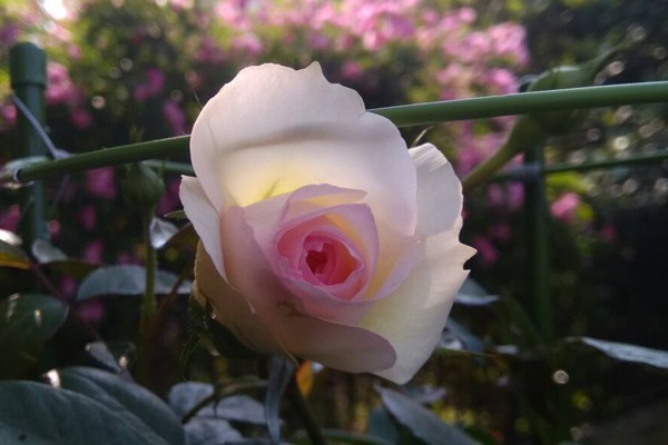 斯蒂芬妮古城堡它的花朵是以小集群的形式开放的非常的艳花并且勤花,它的花色是米白色的、中间的玫红色然后渐变成白色,随着温度的不同斯蒂芬妮古城堡它的颜色深浅也是有变的,温度较低时它的花瓣边缘颜色较深,整体看起来粉嫩嫩的,气温高时颜色则偏白一些。