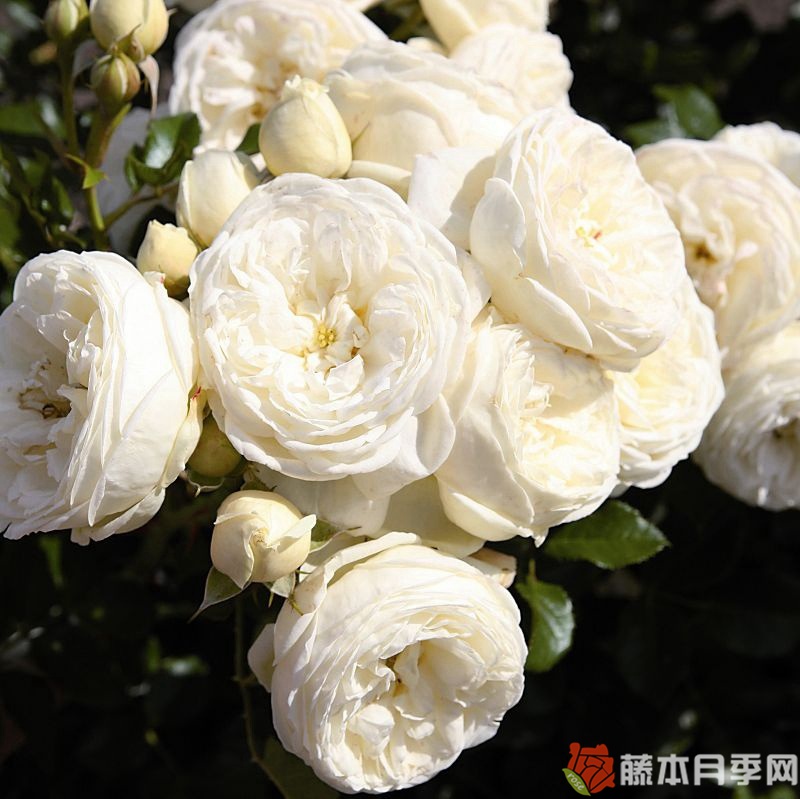 月亮女神/阿耳特弥斯它的花蕾是浅绿色的,初开时是白色球状花,可以看到中间带有一些奶油黄色,然后逐渐开放成杯状,花朵是5-10朵成簇开放,花朵非常大,而且花瓣厚实单花花期持久,也可以用来作切花使用;它的叶子油亮光泽性好,抗病性非常好(抗白粉和黑斑病都是满粉),种植起来非常的简单,也可以和权莓和草花搭配种植,观赏效果更好。