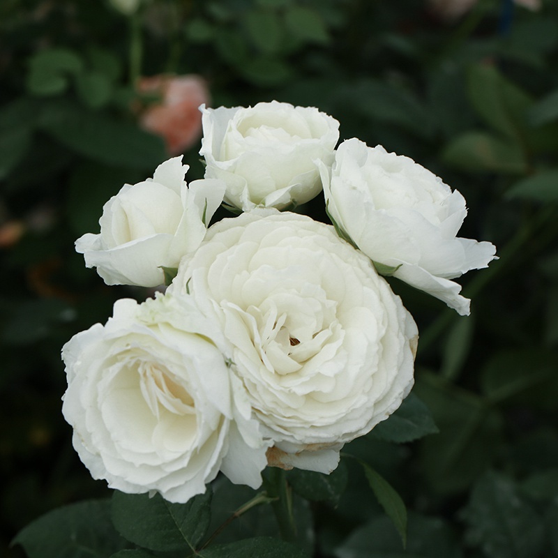 白色云端/白云月季 花朵呈现出完美的圆形杯状,靠近核心部位略带浅桃色,而其花瓣数为160瓣,属于柔软的象牙白色花瓣; 完全开放后花瓣会翻转回来,在中心露出一个可爱的纽扣。