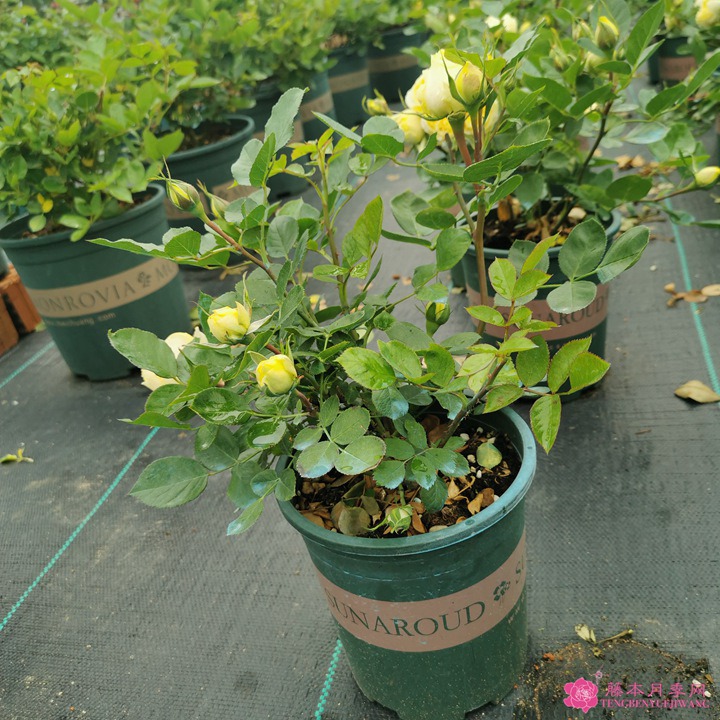 下面是1.5加仑的金丝雀,花朵太多,好多枝条都弯下去了,也没来得及支撑一下,就当压枝了吧。左边那枝带红色的花朵是金丝雀返祖了,金丝雀是浪漫宝贝的芽变,又开回去了,一个植株开二色也是比较特别了。