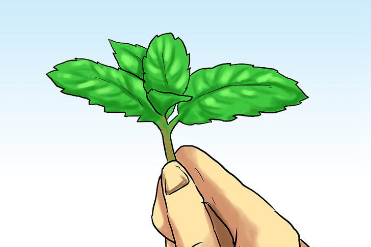 2、从成年薄荷上剪取枝条。如果你的朋友有种植薄荷,你可以找他要些枝条。你也可以去附近的花园采摘薄荷枝条。用锋利的剪刀从节点以上大约1. 3cm的位置将枝条剪断。扦插用的枝条至少要有10-15cm长,并且枝条上大部分的叶子都要摘掉。