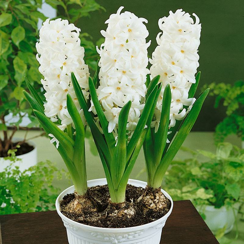 白珍珠-风信子它的花朵是白色的带有一点点的粉,花芯中间是黄色的。